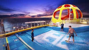 De Flowrider surfsimulator en op de achtergrond de Perfect Storm waterglijbaan.